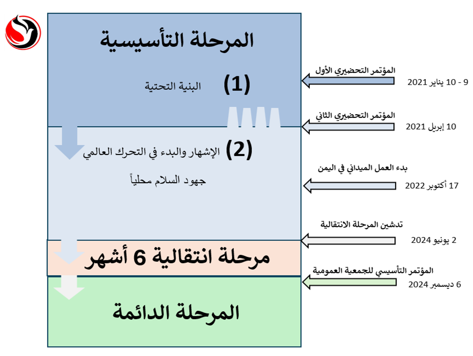 خلال المرحلة الانتقالية، التي ستستمر لمدة ستة أشهر، سيتم تهيئة الوضع والأرضية القانونية الصحيحة لمثل هذا الانتقال عبر إشراك لجان مهنية متخصصة من داخل وخارج التيار، وخبراء على المستوى الوطني والدولي. ستنتهي هذه المرحلة بانعقاد مؤتمر عام للجمعية العمومية بقوامها الكامل، ولمدة يومين، يتم خلالها تقديم تصور متكامل للمرحلة الدائمة لإقراره من قبل أعضاء المؤتمر بشفافية كاملة، تُراعى فيها كل المعايير الوطنية والدولية المعتمدة.